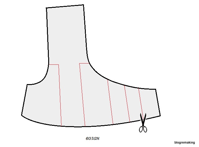 На чистом листе бумаги обведем по контуру деталь полочки, которую мы только что получили. По боковым срезам от линии проймы отложим желаемую длину волана. В моем случае длина составила 20см — получилось немного длиннее, чем в оригинальной модели. Начертим линию низа волана, соединяя плавной линией полученные точки на боковых срезах.