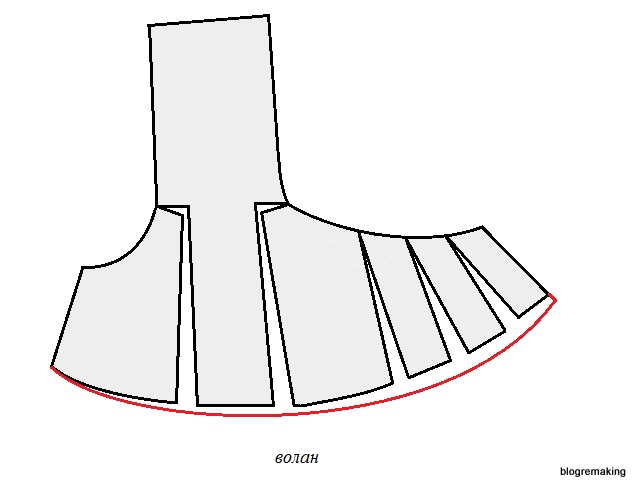На чистом листе бумаги обведем по контуру деталь полочки, которую мы только что получили. По боковым срезам от линии проймы отложим желаемую длину волана. В моем случае длина составила 20см — получилось немного длиннее, чем в оригинальной модели. Начертим линию низа волана, соединяя плавной линией полученные точки на боковых срезах.