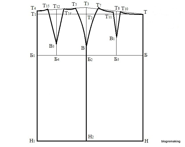 Через точку Б1 проведем вертикаль, до пересечения с линией талией и с линей низа, точки пересечения обозначим Т1 и Н1.