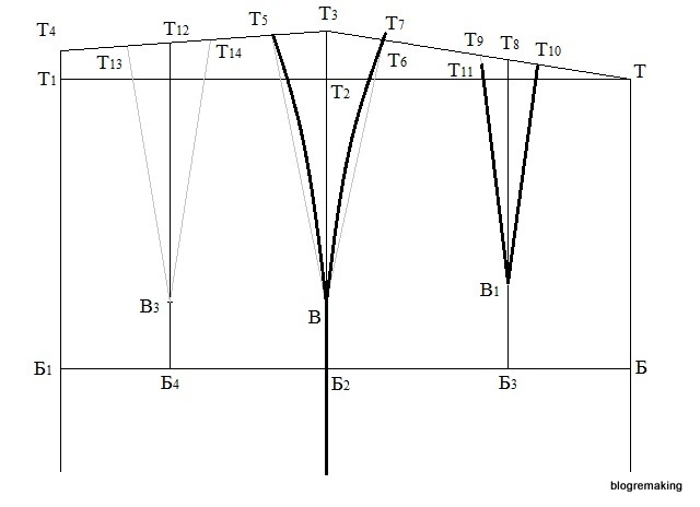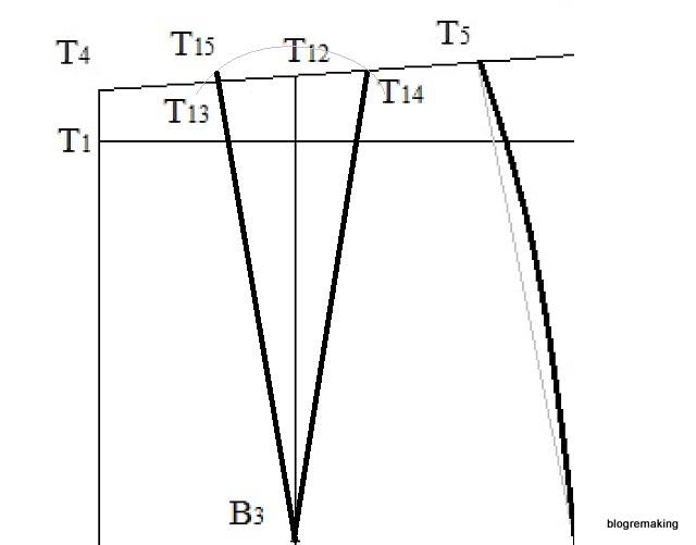 Отложим вниз от точки Т12 14-15см и поставим точку В3 ( Т12В3= 14см).