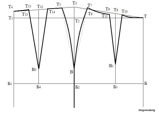 По линии талии от точки Т12 вправо и влево отложим половину раствора задней вытачки и поставим точки Т13 и Т14 (Т13Т12=Т12Т14=4,35:2=2,17см). Полученные точки соединим прямыми с В3
