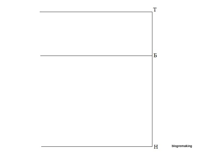 В правом верхнем углу начертим прямой угол с вершиной в точке Т, отступив от верхнего края бумаги 5-10см. Вниз от точки Т отложим отрезок, равный мерке длины от талии до пола минус расстояние от пола до длины юбки и поставим точку Н (отрезок ТН=ДсП-Дюп=100-36=64см). Также на этом отрезке от точки Т вниз отложим длину до бедер и поставим точку Б (отрезок ТБ=Дб=20см). Теперь от каждой точки Т, Б и Н влево проведем горизонтальные прямые.